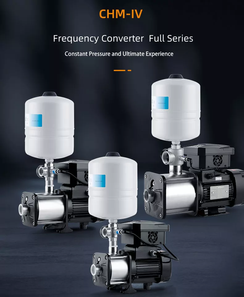 Горизонтальный многоступенчатый центробежный насос из нержавеющей стали серии CHM20/IV с интеллектуальным инвертором представляет собой относительно зрелый продукт на рынке, который в настоящее время имеет компактную конструкцию, стабильную работу, низкий рабочий шум и эффективность до 44-70%. Все компоненты, пропускающие воду, изготовлены из нержавеющей стали AISI304. Он широко используется в