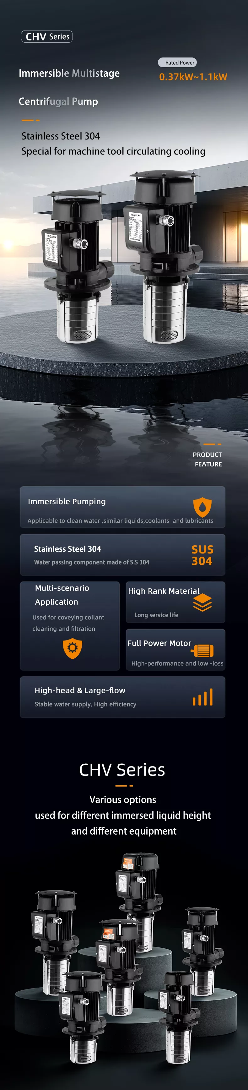 Ниже приводится описание серии CHV. Погружной многоступенчатый центробежный насос CHV, также известный как погружной насос или машинный насос, используется для подачи охлаждающей жидкости, смазки, конденсата, промышленного очистного оборудования, систем фильтрации и других применений, подходящих для использования погружного насоса. Он идеально подходит для интеграции со станками, шлифовальными станками, обрабатывающими центрами с ЧПУ, электроэрозионными станками, промышленными очистительными машинами и другим оборудованием.